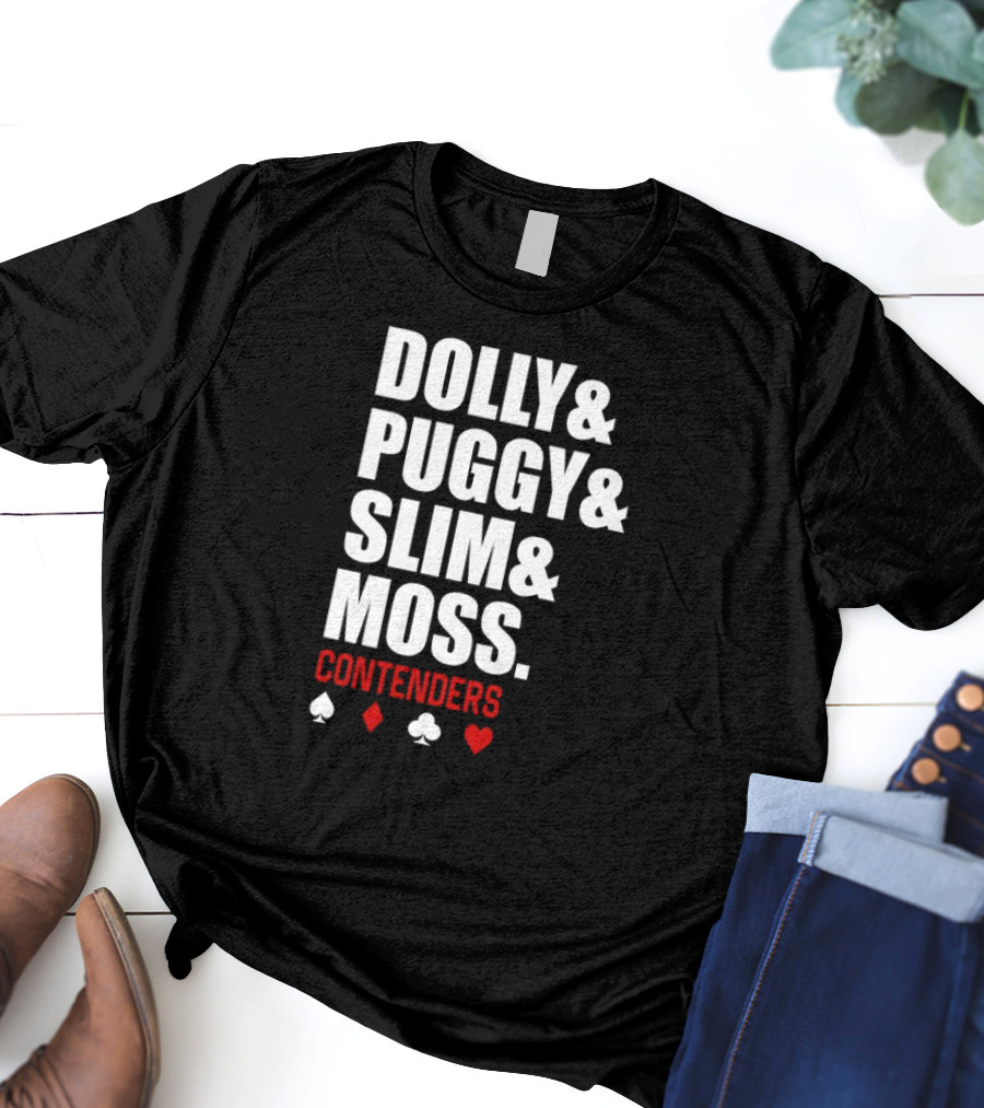 Dolly Puggy Slim Moss Contenders Spade Diamond Club Heart Icons Shirt made from 100% pre-shrunk ring-spun cotton, unisex regular fit based on U.S. standard sizing. The shirt is designed, cut, sewn, and printed in the United States. Available in sizes S-5XL.