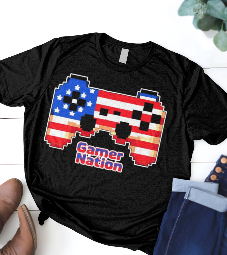 American Flag Pixel Art Gamer Nation Controller Shirt made from 100% pre-shrunk ring-spun cotton, unisex regular fit based on U.S. standard sizing. The shirt is designed, cut, sewn, and printed in the United States. Available in sizes S-5XL.