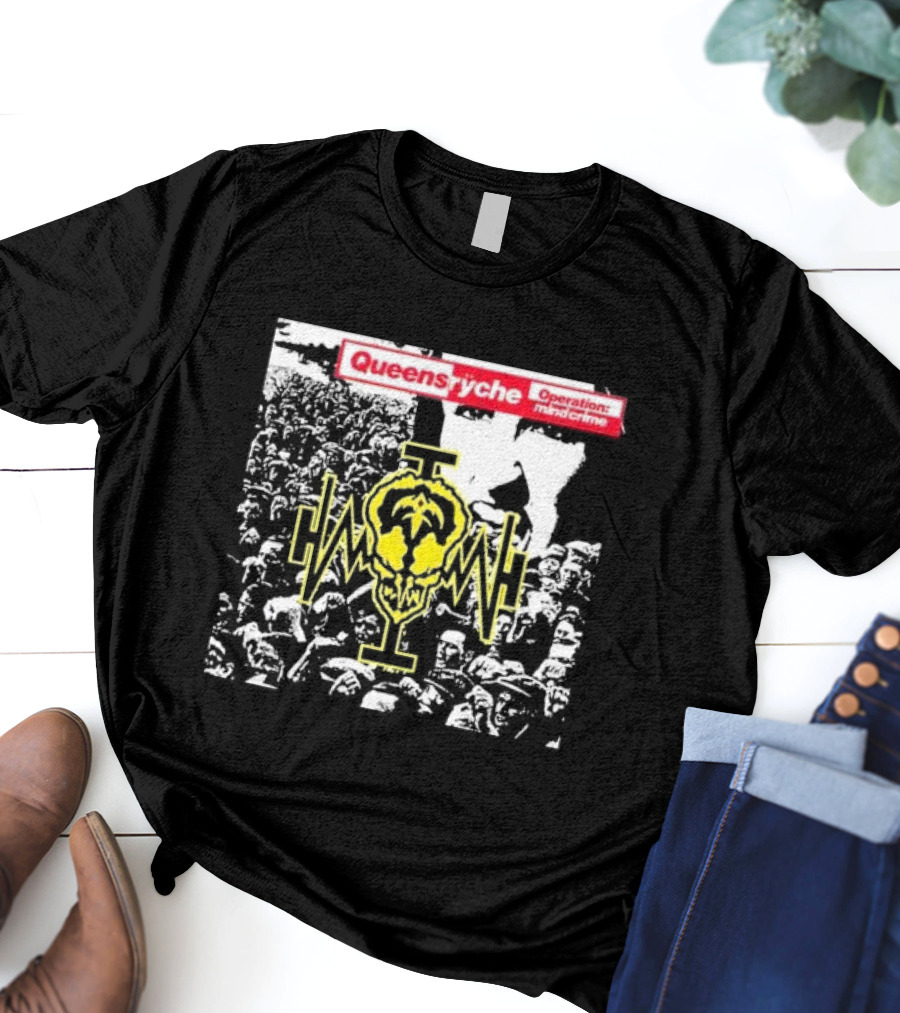 Queensryche Operation: Mindcrime Yellow Skull Symbol Over Crowd Shirt made from 100% pre-shrunk ring-spun cotton, unisex regular fit based on U.S. standard sizing. The shirt is designed, cut, sewn, and printed in the United States. Available in sizes S-5XL.