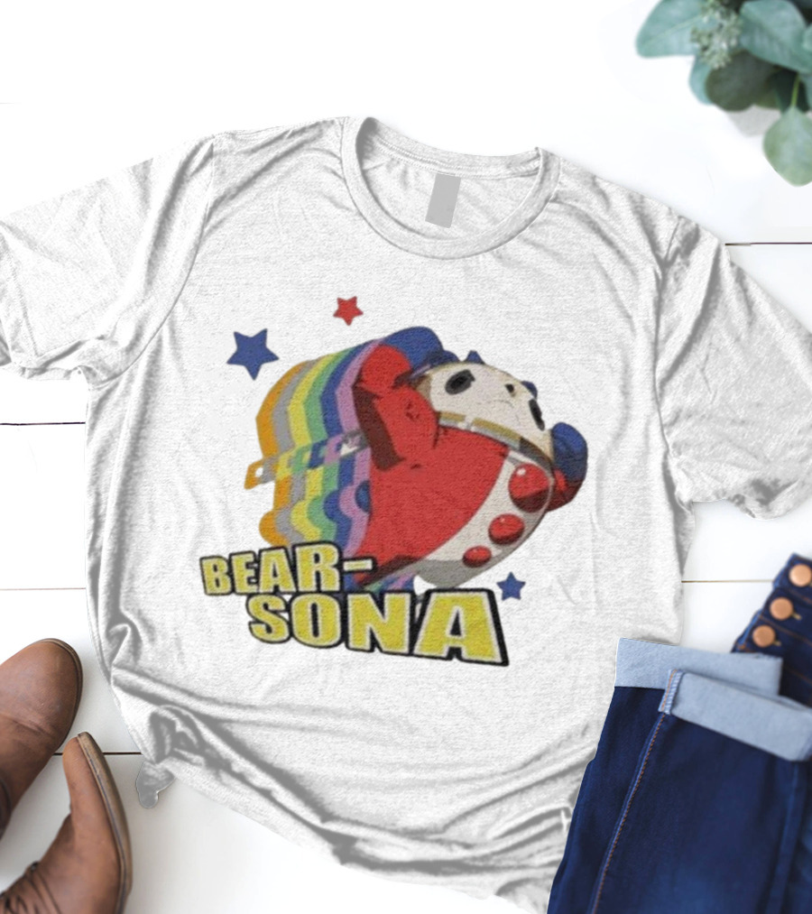 Bear-Sona Teddie Persona 4 Character Red Outfit Psychedelic Stars Shirt made from 100% pre-shrunk ring-spun cotton, unisex regular fit based on U.S. standard sizing. The shirt is designed, cut, sewn, and printed in the United States. Available in sizes S-5XL.
