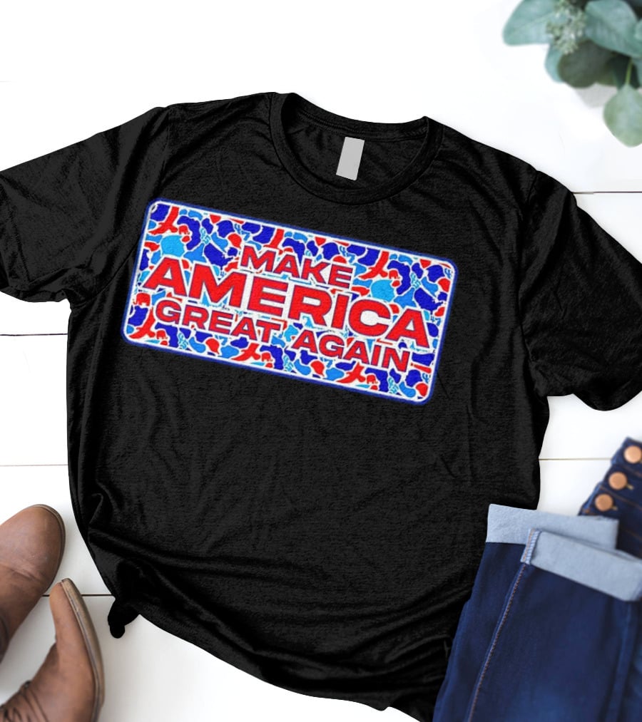 Make America Great Again Camo Red Blue White Shirt made from 100% pre-shrunk ring-spun cotton, unisex regular fit based on U.S. standard sizing. The shirt is designed, cut, sewn, and printed in the United States. Available in sizes S-5XL.