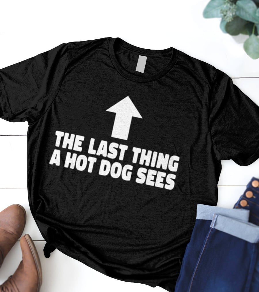 Arrow Pointing Up The Last Thing A Hotdog Sees Shirt made from 100% pre-shrunk ring-spun cotton, unisex regular fit based on U.S. standard sizing. The shirt is designed, cut, sewn, and printed in the United States. Available in sizes S-5XL.
