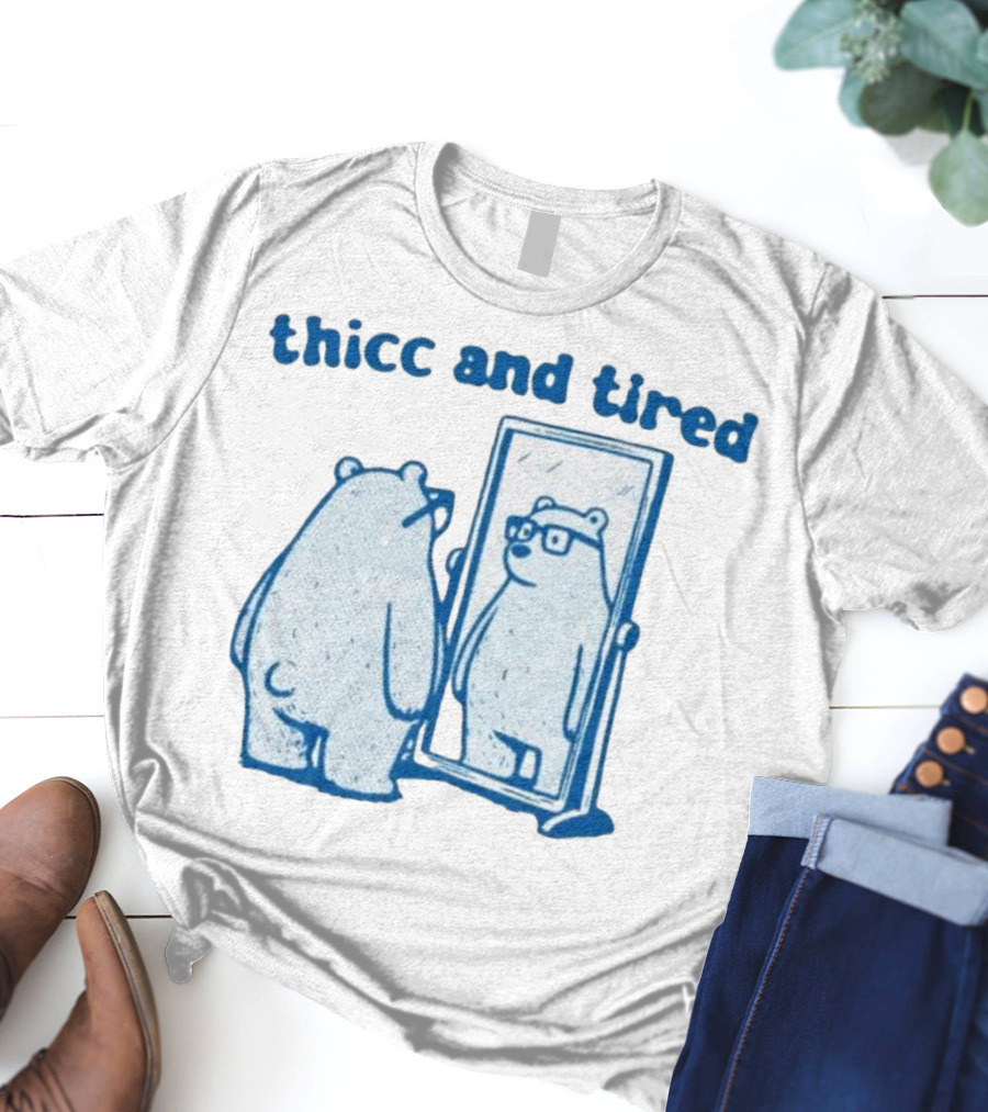 Thicc and Tired Bear with Glasses in Mirror Shirt made from 100% pre-shrunk ring-spun cotton, unisex regular fit based on U.S. standard sizing. The shirt is designed, cut, sewn, and printed in the United States. Available in sizes S-5XL.