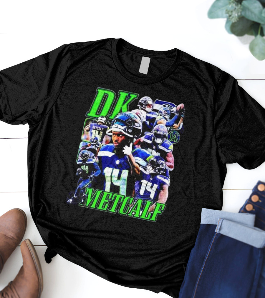 DK Metcalf Seattle Seahawks 14 Retro NFL Player Action Collage Shirt made from 100% pre-shrunk ring-spun cotton, unisex regular fit based on U.S. standard sizing. The shirt is designed, cut, sewn, and printed in the United States. Available in sizes S-5XL.