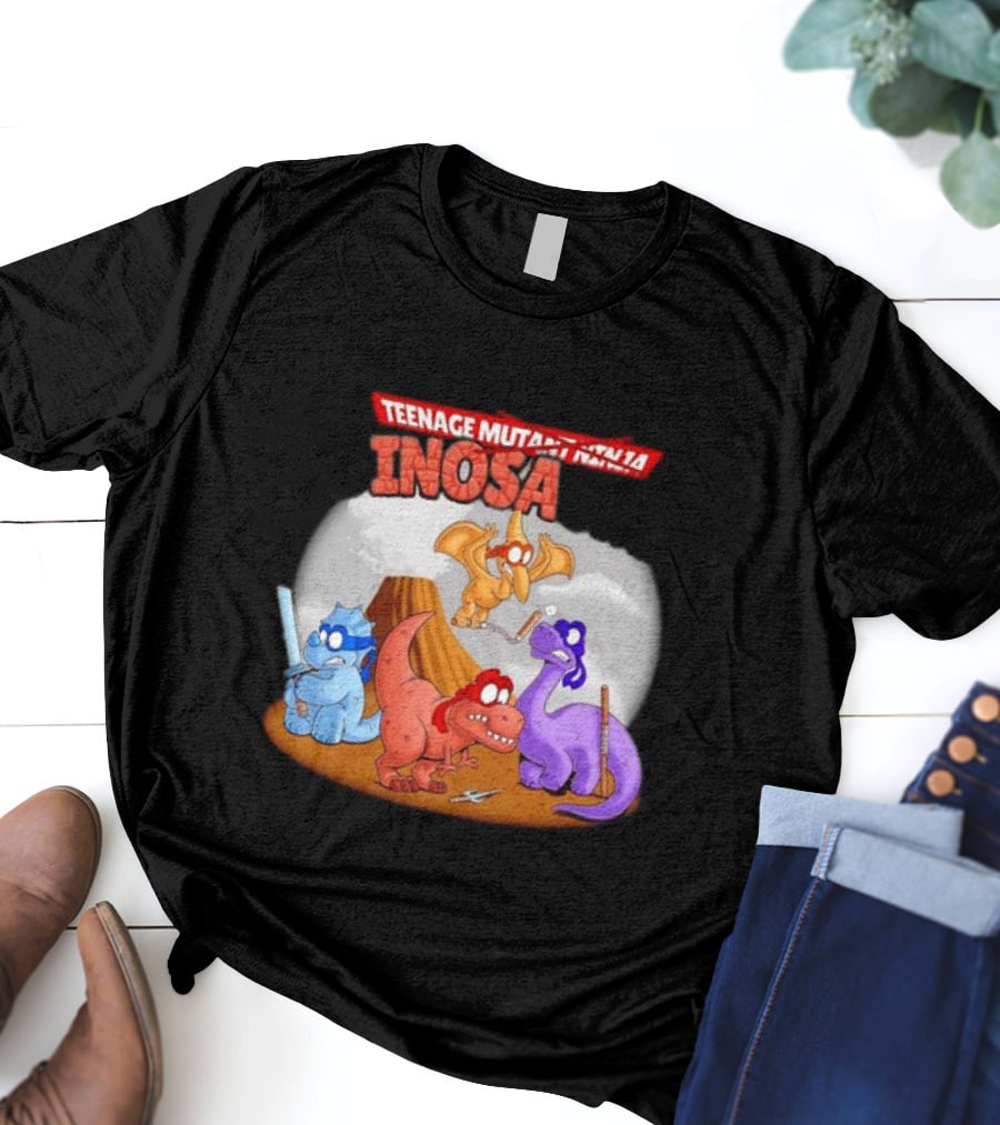 Teenage Mutant Ninja Dinosaurs INOSA Shirt made from 100% pre-shrunk ring-spun cotton, unisex regular fit based on U.S. standard sizing. The shirt is designed, cut, sewn, and printed in the United States. Available in sizes S-5XL.