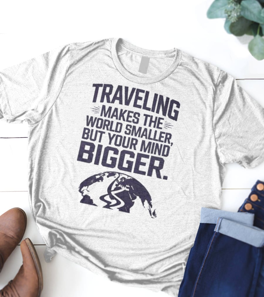 Traveling Makes the World Smaller But Your Mind Bigger Earth Map Shirt made from 100% pre-shrunk ring-spun cotton, unisex regular fit based on U.S. standard sizing. The shirt is designed, cut, sewn, and printed in the United States. Available in sizes S-5XL.