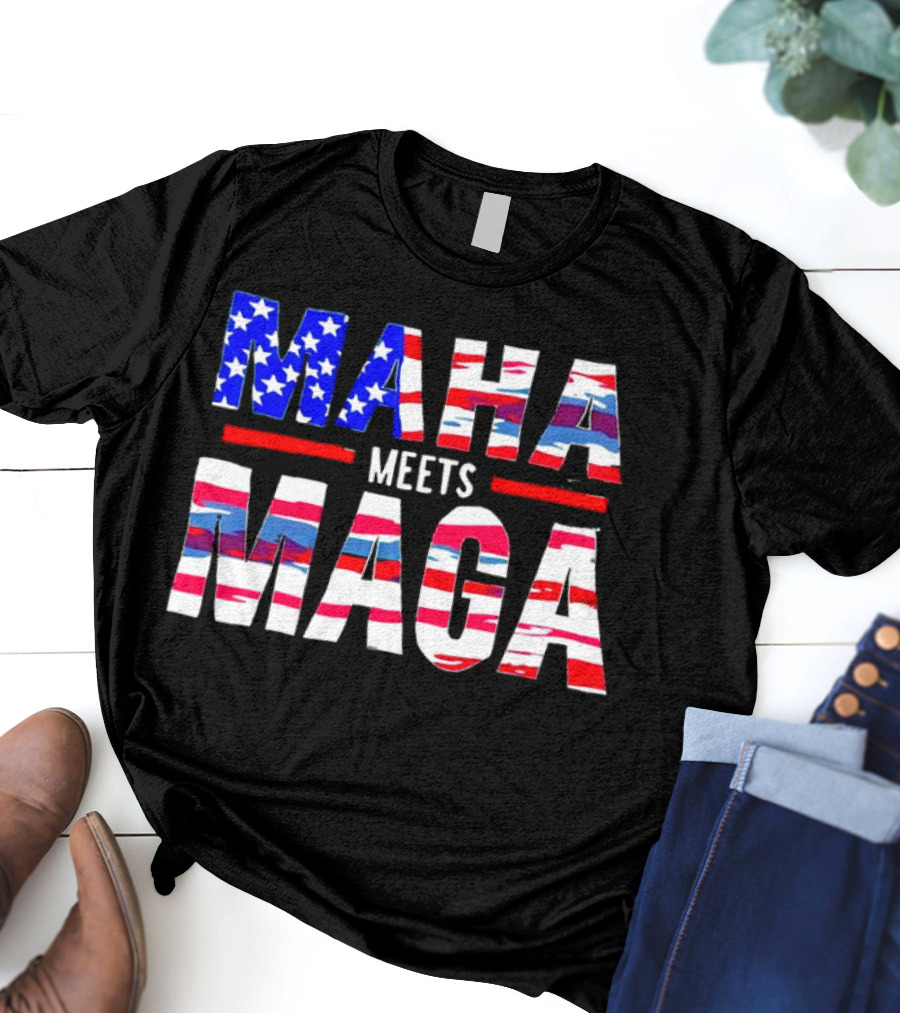 MAHA Meets MAGA US Flag Shirt made from 100% pre-shrunk ring-spun cotton, unisex regular fit based on U.S. standard sizing. The shirt is designed, cut, sewn, and printed in the United States. Available in sizes S-5XL.