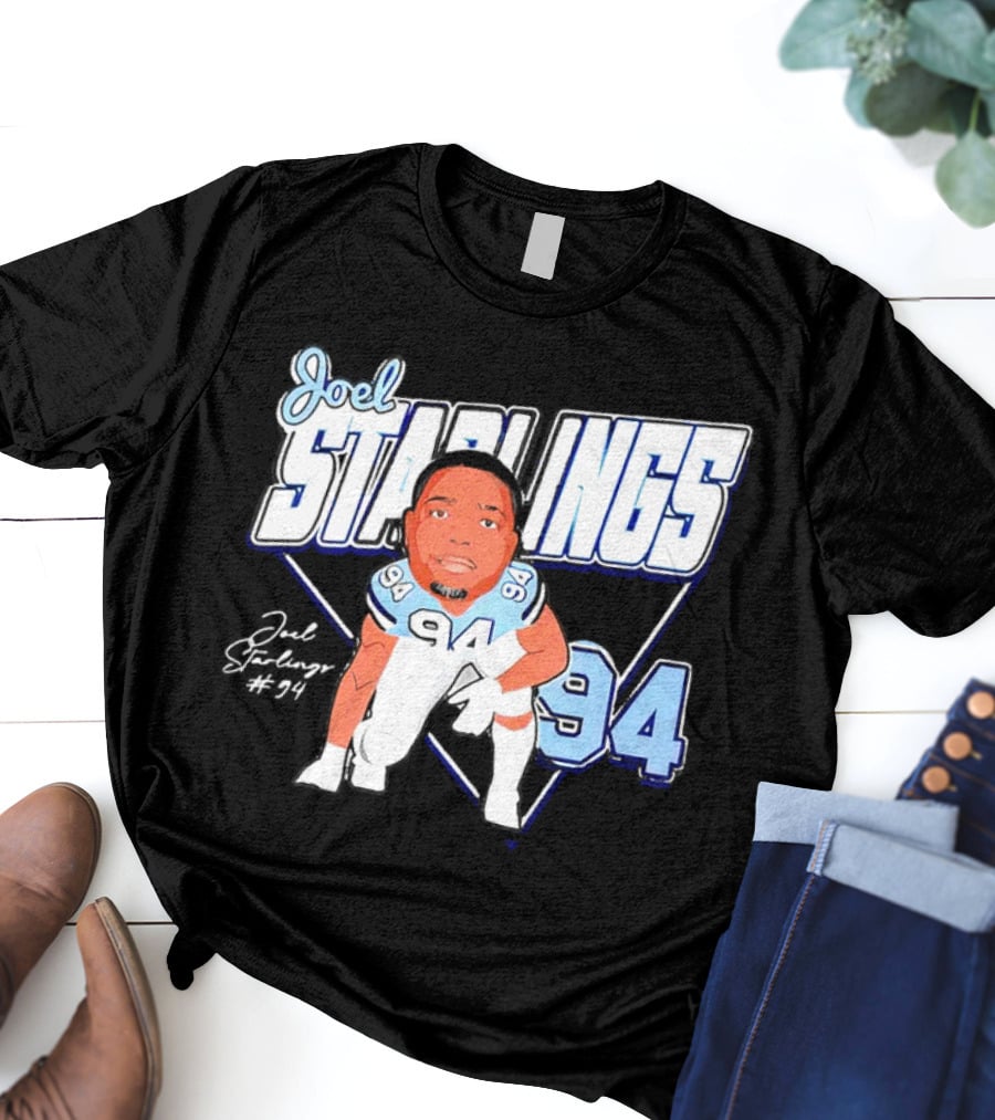 Joel Starlings North Carolina Tar Heels #94 Cartoon Character Shirt made from 100% pre-shrunk ring-spun cotton, unisex regular fit based on U.S. standard sizing. The shirt is designed, cut, sewn, and printed in the United States. Available in sizes S-5XL.