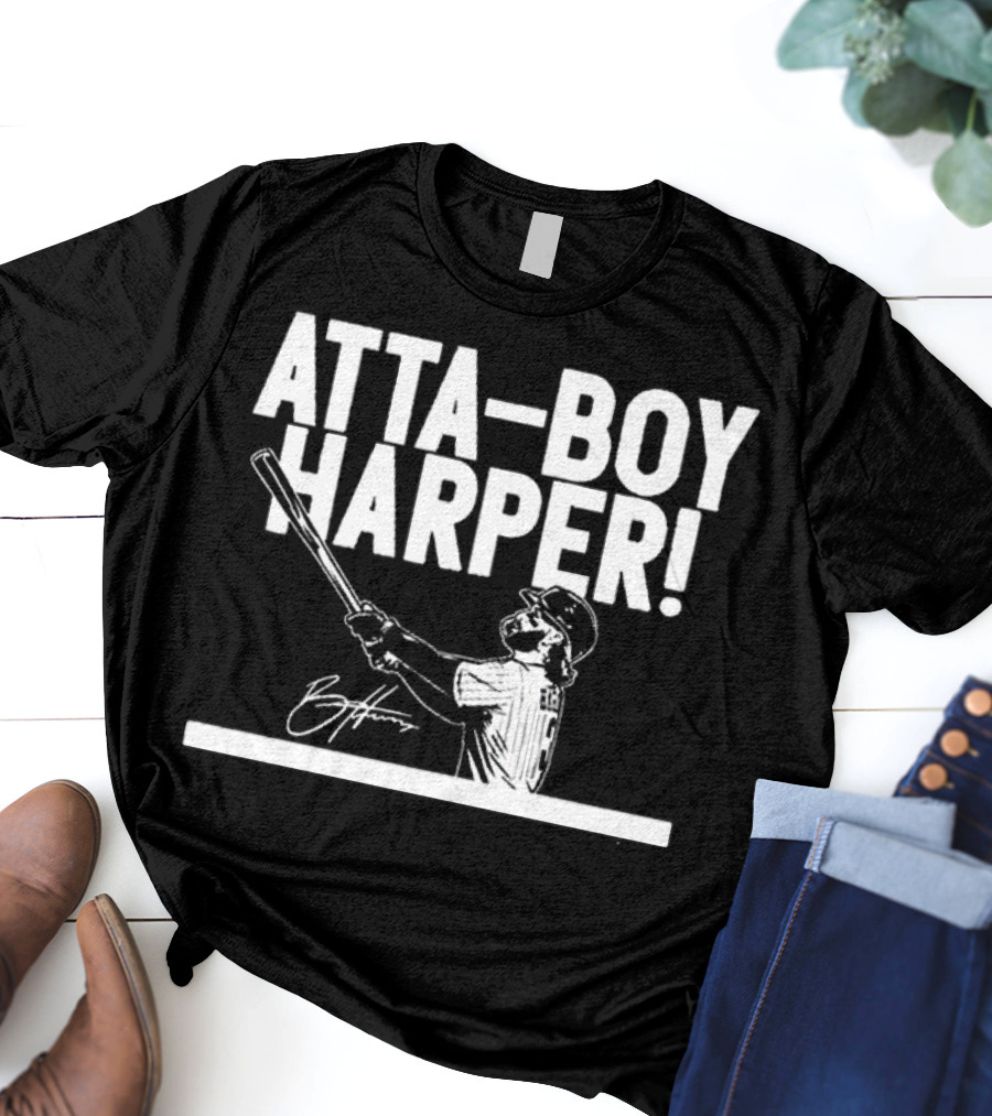 Philadelphia Phillies Atta-boy Harper Signature Baseball Shirt made from 100% pre-shrunk ring-spun cotton, unisex regular fit based on U.S. standard sizing. The shirt is designed, cut, sewn, and printed in the United States. Available in sizes S-5XL.