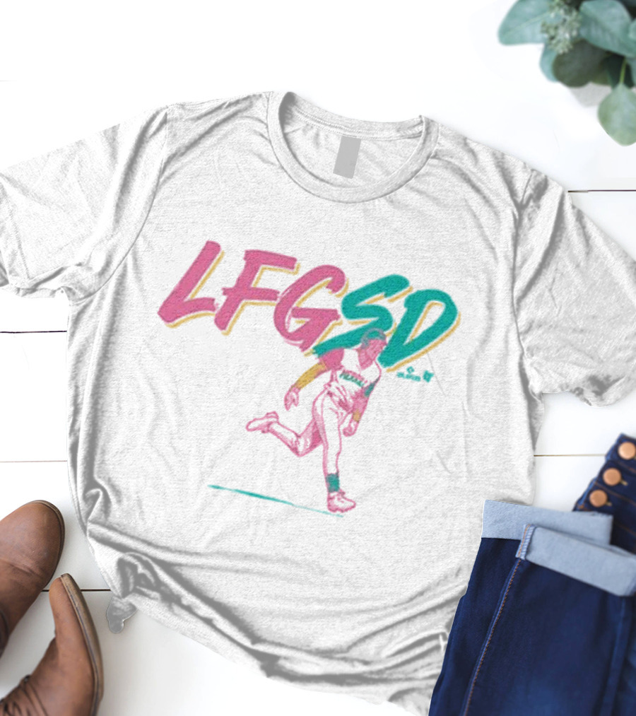 Jackson Merrill LFGSD Neon Baseball Running Shirt made from 100% pre-shrunk ring-spun cotton, unisex regular fit based on U.S. standard sizing. The shirt is designed, cut, sewn, and printed in the United States. Available in sizes S-5XL.