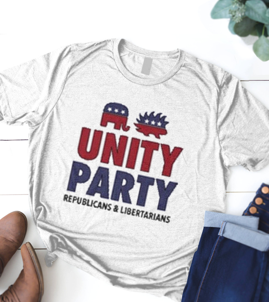 Unity Party Republicans and Libertarians Shirt made from 100% pre-shrunk ring-spun cotton, unisex regular fit based on U.S. standard sizing. The shirt is designed, cut, sewn, and printed in the United States. Available in sizes S-5XL.