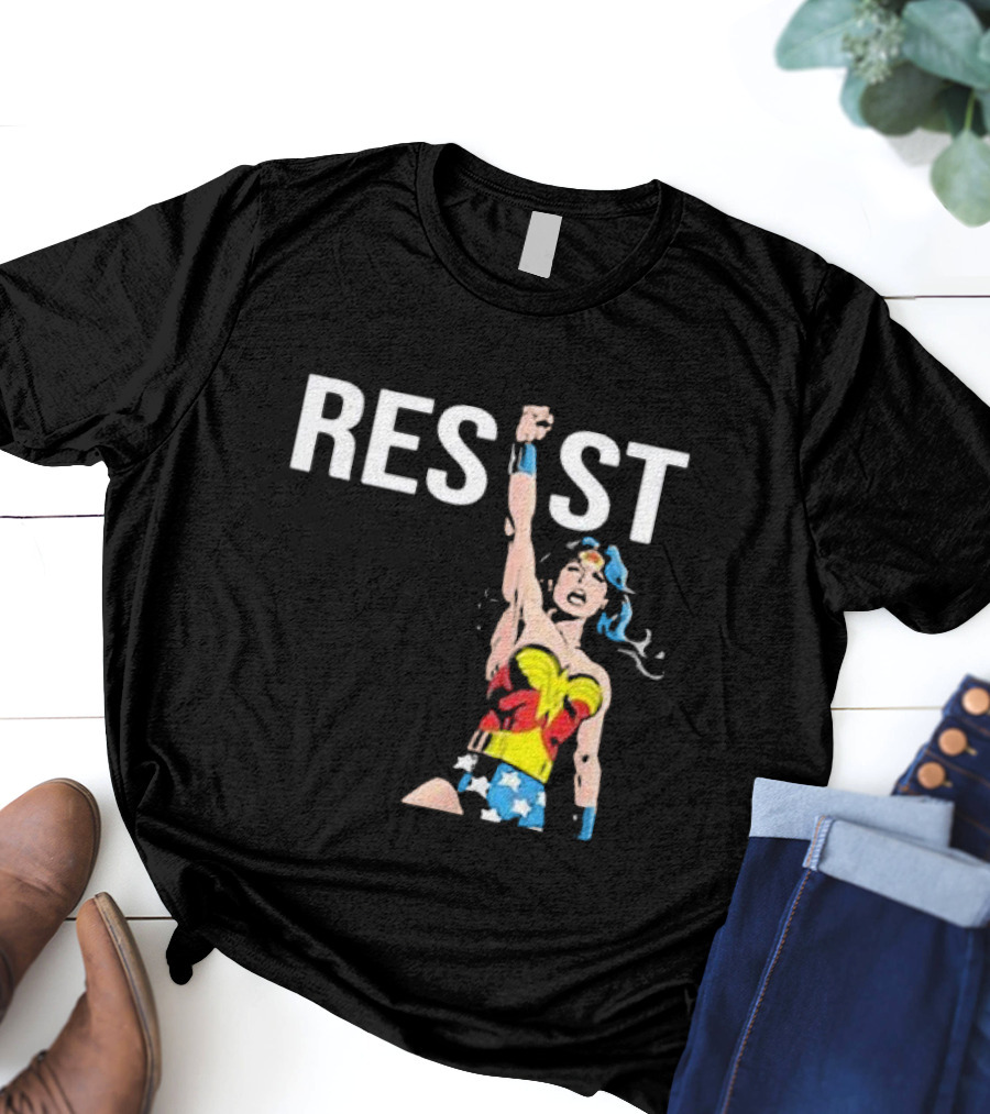 Wonder Woman Resist Power Iconic Fist Uplift Shirt made from 100% pre-shrunk ring-spun cotton, unisex regular fit based on U.S. standard sizing. The shirt is designed, cut, sewn, and printed in the United States. Available in sizes S-5XL.