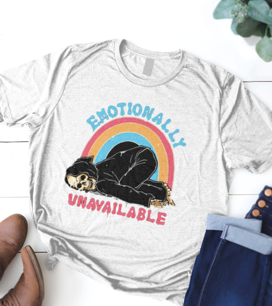 Emotionally Unavailable Skeleton Rainbow Shirt made from 100% pre-shrunk ring-spun cotton, unisex regular fit based on U.S. standard sizing. The shirt is designed, cut, sewn, and printed in the United States. Available in sizes S-5XL.