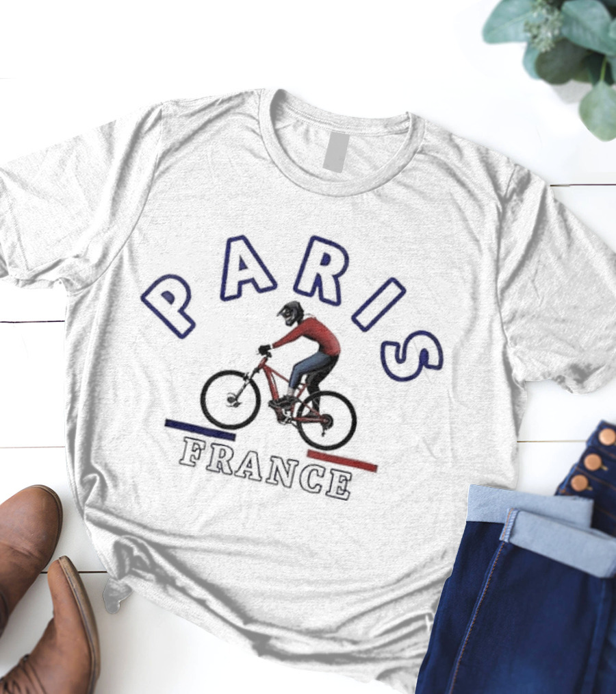 PARIS FRANCE BICYCLE RIDER IN RED AND BLUE Shirt made from 100% pre-shrunk ring-spun cotton, unisex regular fit based on U.S. standard sizing. The shirt is designed, cut, sewn, and printed in the United States. Available in sizes S-5XL.