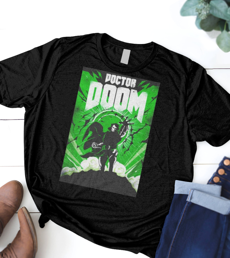 Doctor Doom Doomsday Green Energy Burst Comic Style Villain Power Stance Shirt made from 100% pre-shrunk ring-spun cotton, unisex regular fit based on U.S. standard sizing. The shirt is designed, cut, sewn, and printed in the United States. Available in sizes S-5XL.