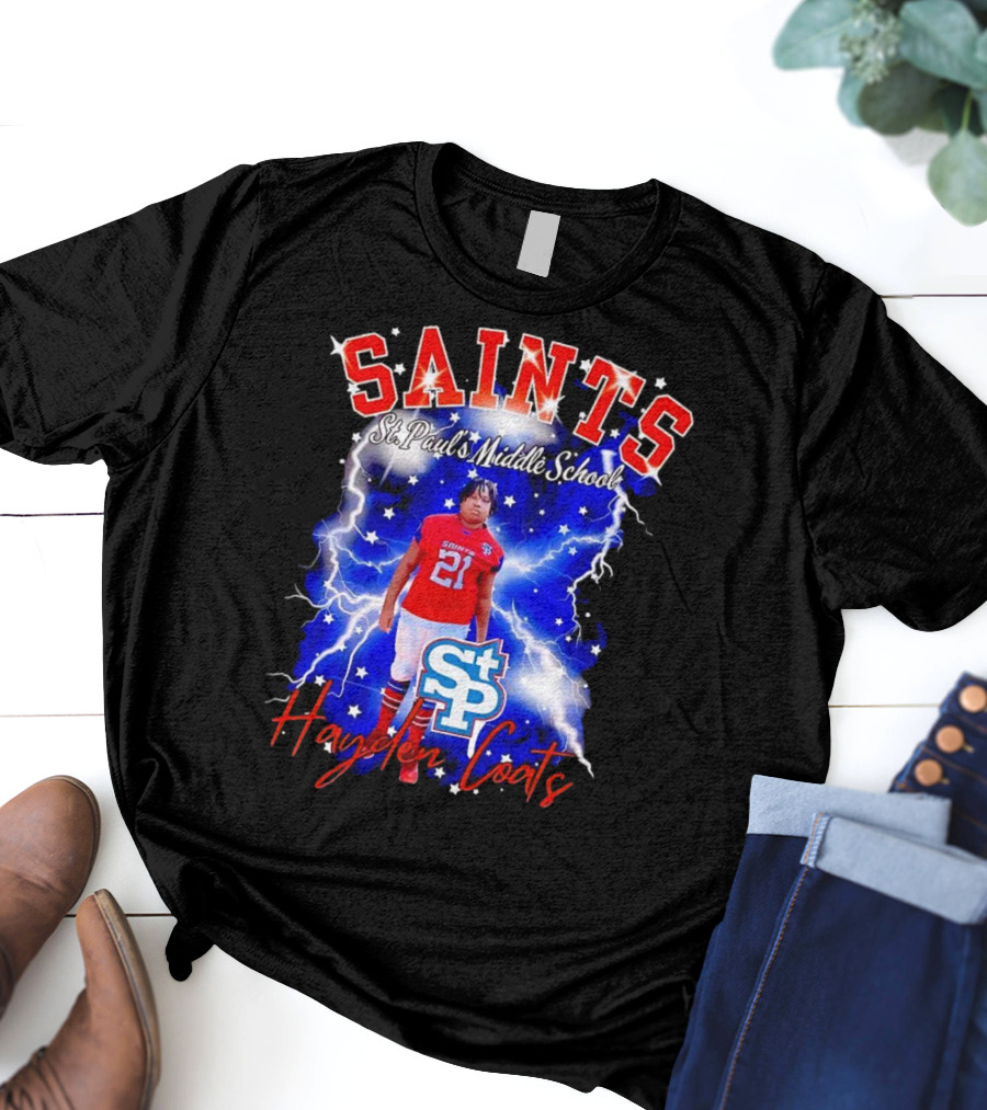 Saints St Paul’s Middle School Football Hayden Coats 21 Lightning Background Shirt made from 100% pre-shrunk ring-spun cotton, unisex regular fit based on U.S. standard sizing. The shirt is designed, cut, sewn, and printed in the United States. Available in sizes S-5XL.