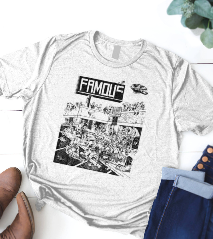 Famous Stars Chaos Scene in Urban Streetscape Shirt made from 100% pre-shrunk ring-spun cotton, unisex regular fit based on U.S. standard sizing. The shirt is designed, cut, sewn, and printed in the United States. Available in sizes S-5XL.