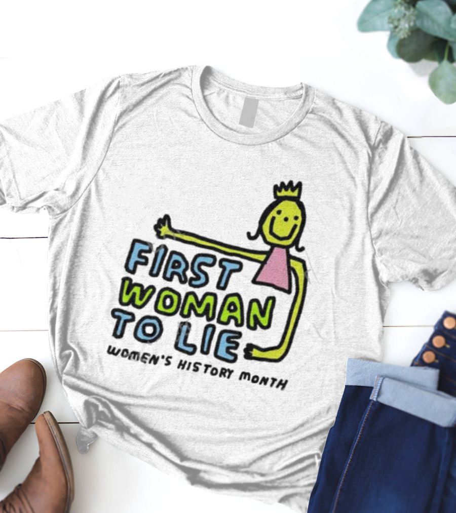 First Woman To Lie Women's History Month Drawing of Smiling Woman with Crown Shirt made from 100% pre-shrunk ring-spun cotton, unisex regular fit based on U.S. standard sizing. The shirt is designed, cut, sewn, and printed in the United States. Available in sizes S-5XL.