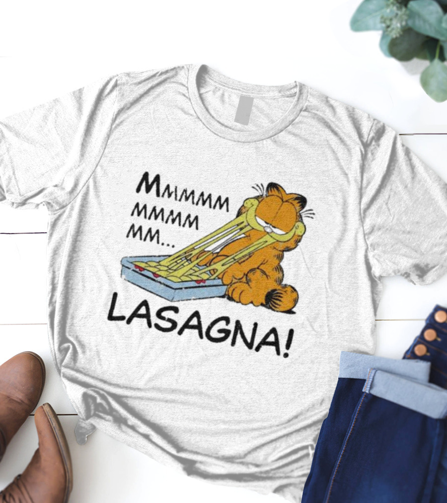 Garfield Mmmmmmmm MM Lasagna Shirt made from 100% pre-shrunk ring-spun cotton, unisex regular fit based on U.S. standard sizing. The shirt is designed, cut, sewn, and printed in the United States. Available in sizes S-5XL.