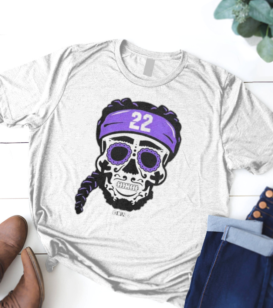 Derrick Henry 22 NFLPA Sugar Skull Baltimore Ravens Braids Shirt made from 100% pre-shrunk ring-spun cotton, unisex regular fit based on U.S. standard sizing. The shirt is designed, cut, sewn, and printed in the United States. Available in sizes S-5XL.