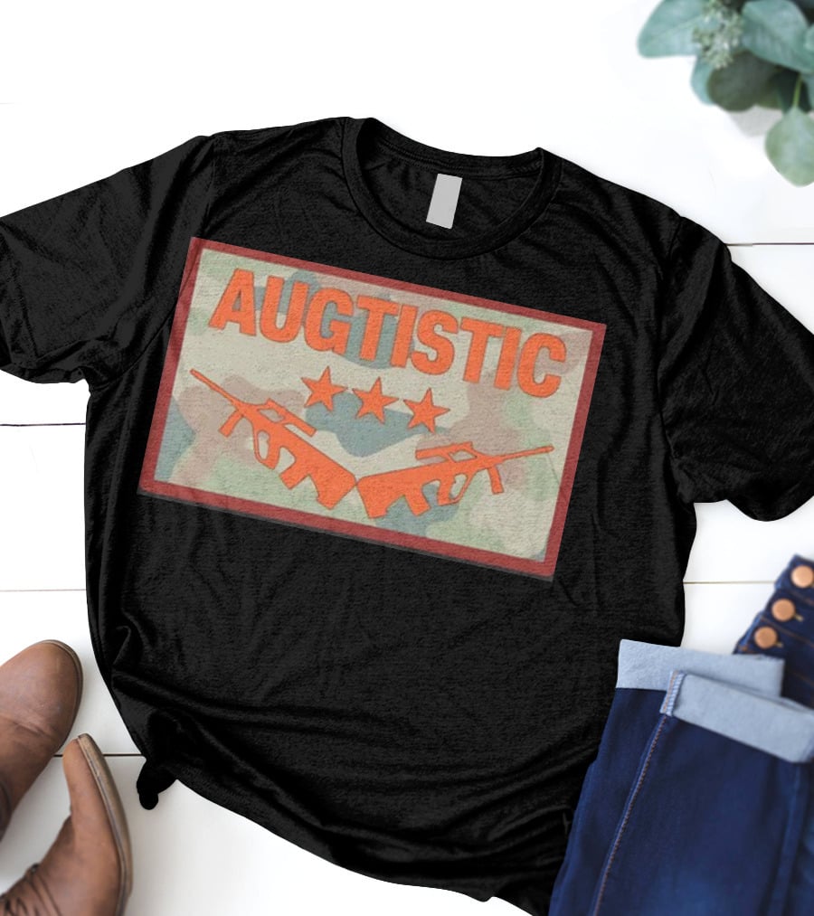 AUGTISTIC Stars and Rifles on Camouflage Background Shirt made from 100% pre-shrunk ring-spun cotton, unisex regular fit based on U.S. standard sizing. The shirt is designed, cut, sewn, and printed in the United States. Available in sizes S-5XL.