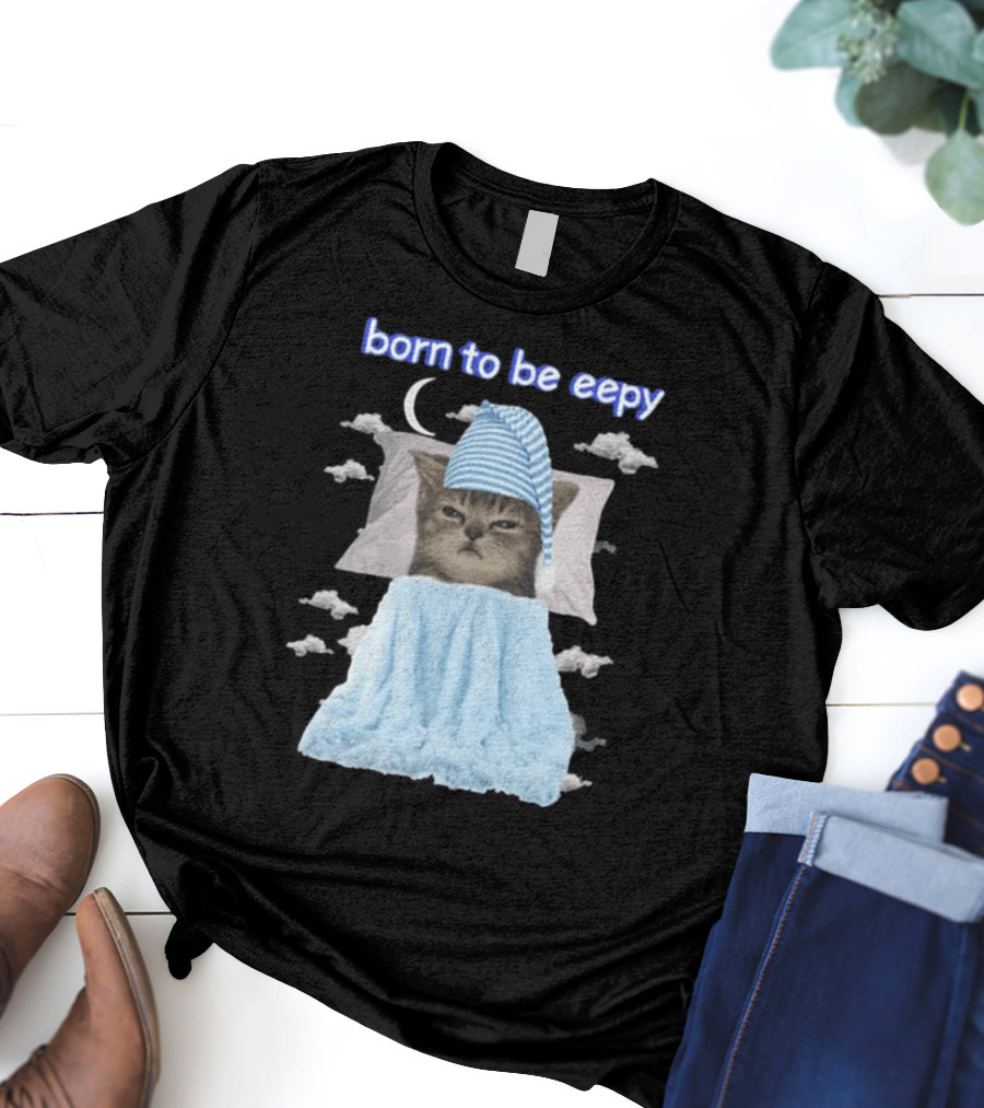 Born to Be Eepy Sleepy Cat with Striped Nightcap and Clouds Shirt made from 100% pre-shrunk ring-spun cotton, unisex regular fit based on U.S. standard sizing. The shirt is designed, cut, sewn, and printed in the United States. Available in sizes S-5XL.