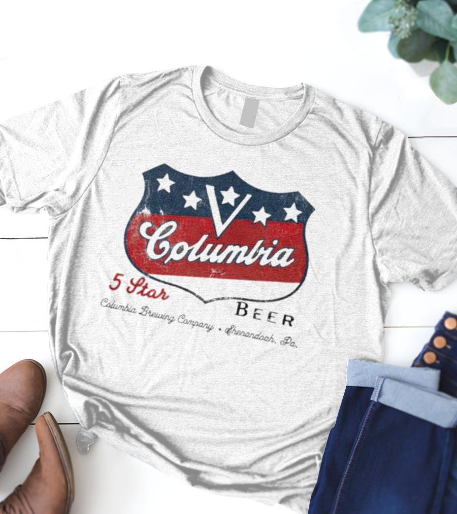 Columbia 5 Star Beer Columbia Brewing Company Shenandoah Pa Emblem Shirt made from 100% pre-shrunk ring-spun cotton, unisex regular fit based on U.S. standard sizing. The shirt is designed, cut, sewn, and printed in the United States. Available in sizes S-5XL.