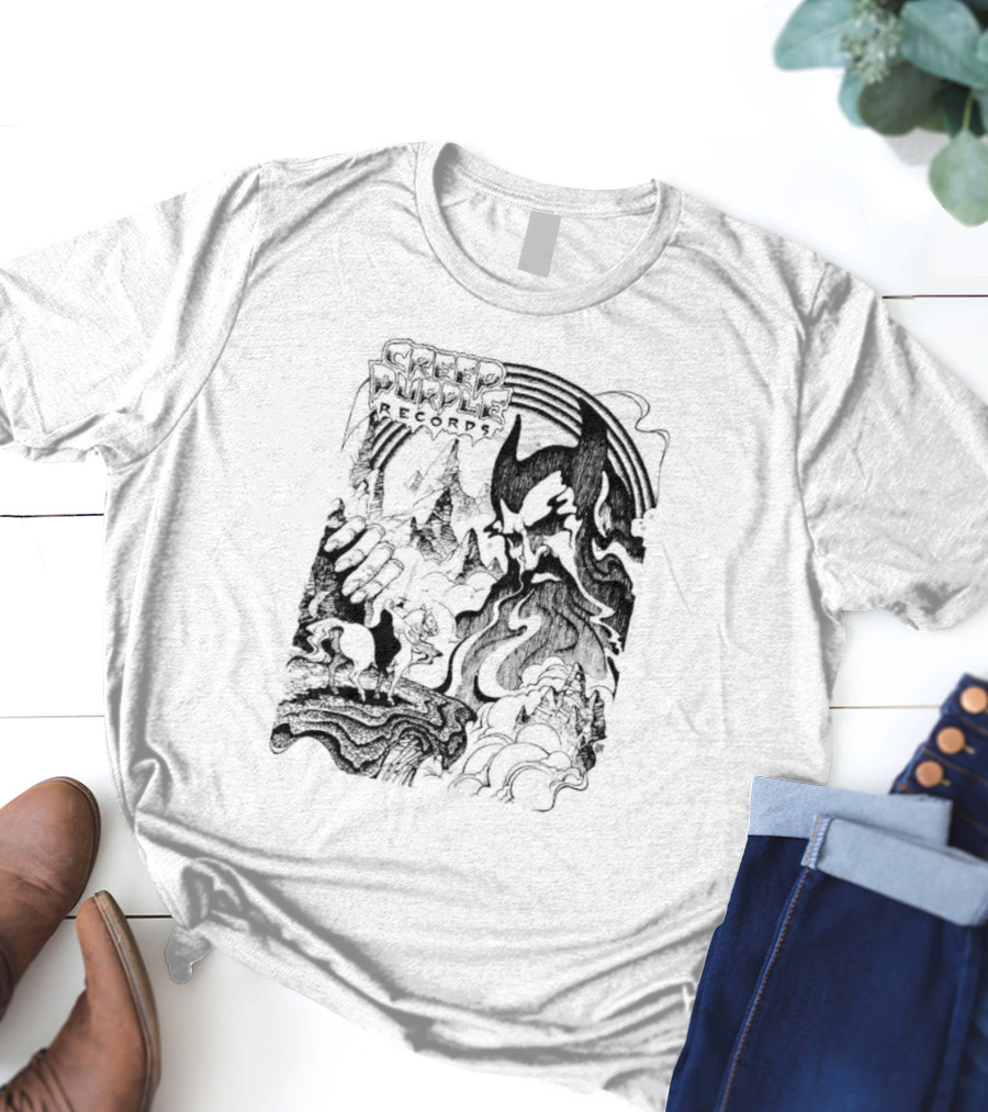 Creep Purple Records Devil Mountain Landscape with Horse and Rainbow Shirt made from 100% pre-shrunk ring-spun cotton, unisex regular fit based on U.S. standard sizing. The shirt is designed, cut, sewn, and printed in the United States. Available in sizes S-5XL.