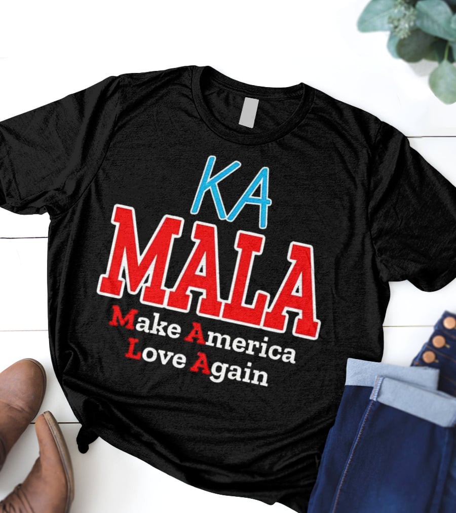 KA MALA Make America Love Again Shirt made from 100% pre-shrunk ring-spun cotton, unisex regular fit based on U.S. standard sizing. The shirt is designed, cut, sewn, and printed in the United States. Available in sizes S-5XL.