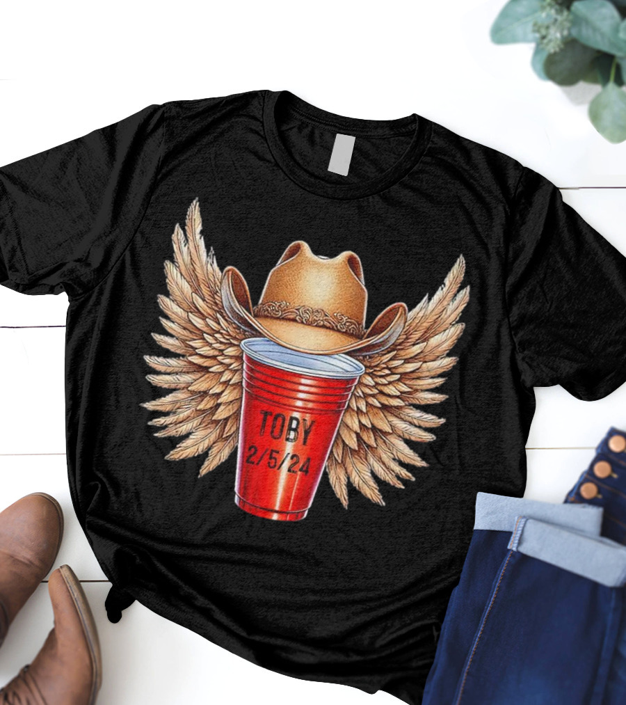 Toby Keith Toby Red Cup 2/5/24 Winged Cowboy Hat Shirt made from 100% pre-shrunk ring-spun cotton, unisex regular fit based on U.S. standard sizing. The shirt is designed, cut, sewn, and printed in the United States. Available in sizes S-5XL.