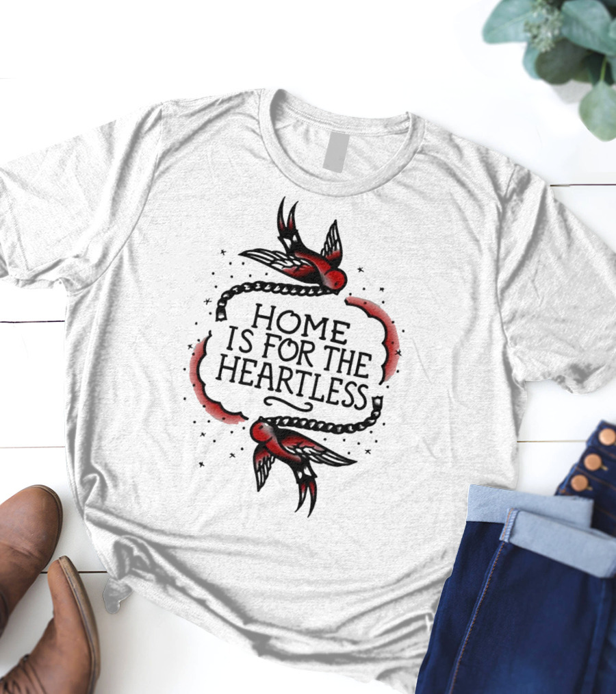 Home Is for the Heartless Red Swallows and Chain Shirt made from 100% pre-shrunk ring-spun cotton, unisex regular fit based on U.S. standard sizing. The shirt is designed, cut, sewn, and printed in the United States. Available in sizes S-5XL.