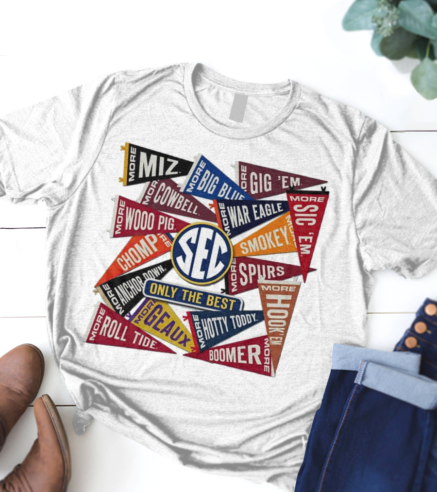 SEC Only the Best Mizzou Tigers More Pennants Shirt made from 100% pre-shrunk ring-spun cotton, unisex regular fit based on U.S. standard sizing. The shirt is designed, cut, sewn, and printed in the United States. Available in sizes S-5XL.