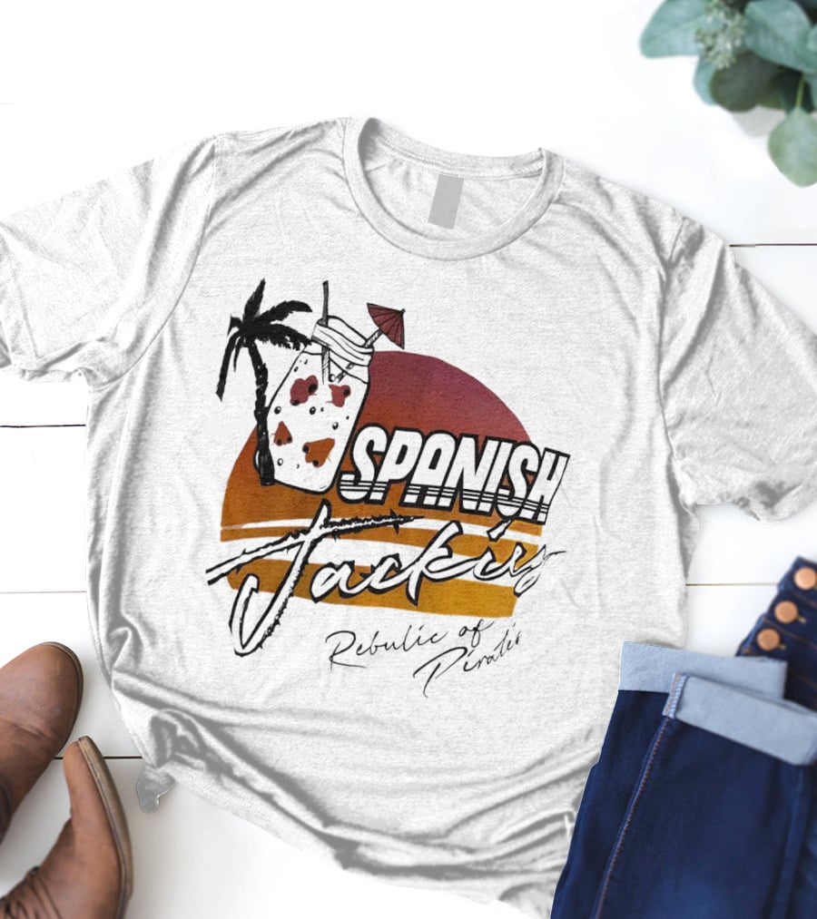 Spanish Jacking Republic of Pirates Sunset Palm Tropical Drink Shirt made from 100% pre-shrunk ring-spun cotton, unisex regular fit based on U.S. standard sizing. The shirt is designed, cut, sewn, and printed in the United States. Available in sizes S-5XL.