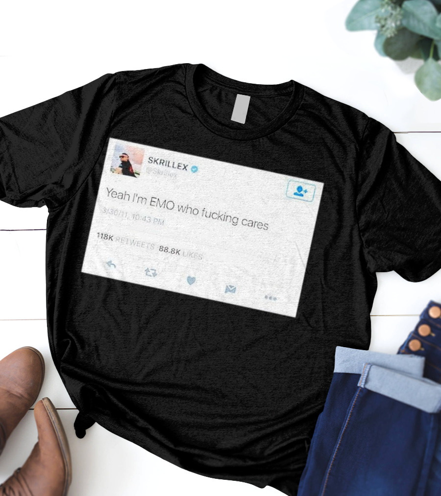 Skrillex Yeah I'm Emo Who Fcking Cares Tweet 118k Retweets 88.8k Likes Shirt made from 100% pre-shrunk ring-spun cotton, unisex regular fit based on U.S. standard sizing. The shirt is designed, cut, sewn, and printed in the United States. Available in sizes S-5XL.