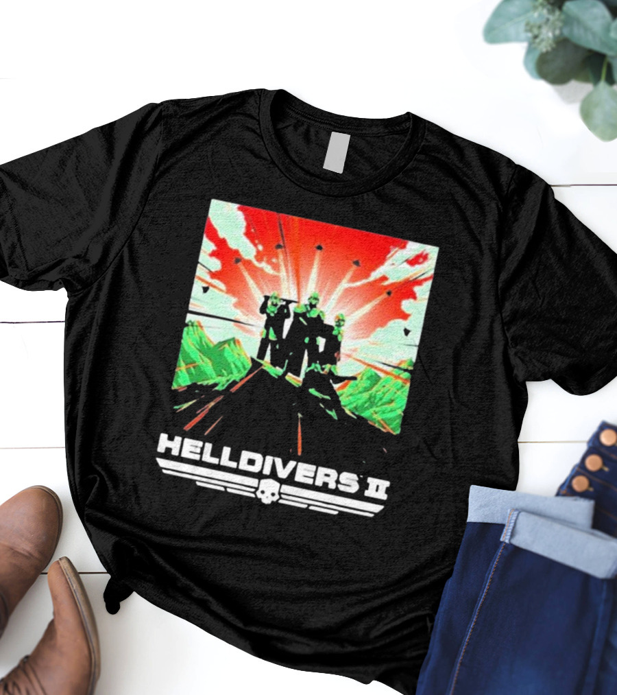 HELLDIVERS II Colorful Video Game Artwork Shirt made from 100% pre-shrunk ring-spun cotton, unisex regular fit based on U.S. standard sizing. The shirt is designed, cut, sewn, and printed in the United States. Available in sizes S-5XL.