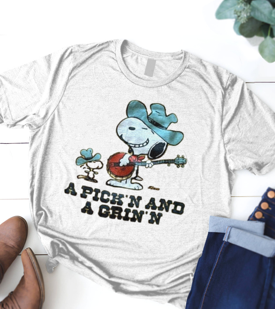 Snoopy A Pick’n And A Grin’n Country Banjo Player Cowboy Hat Shirt made from 100% pre-shrunk ring-spun cotton, unisex regular fit based on U.S. standard sizing. The shirt is designed, cut, sewn, and printed in the United States. Available in sizes S-5XL.
