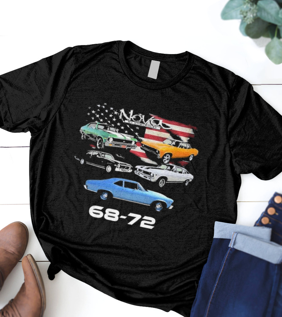 Nova by Chevrolet 68-72 American Flag Classic Cars Shirt made from 100% pre-shrunk ring-spun cotton, unisex regular fit based on U.S. standard sizing. The shirt is designed, cut, sewn, and printed in the United States. Available in sizes S-5XL.