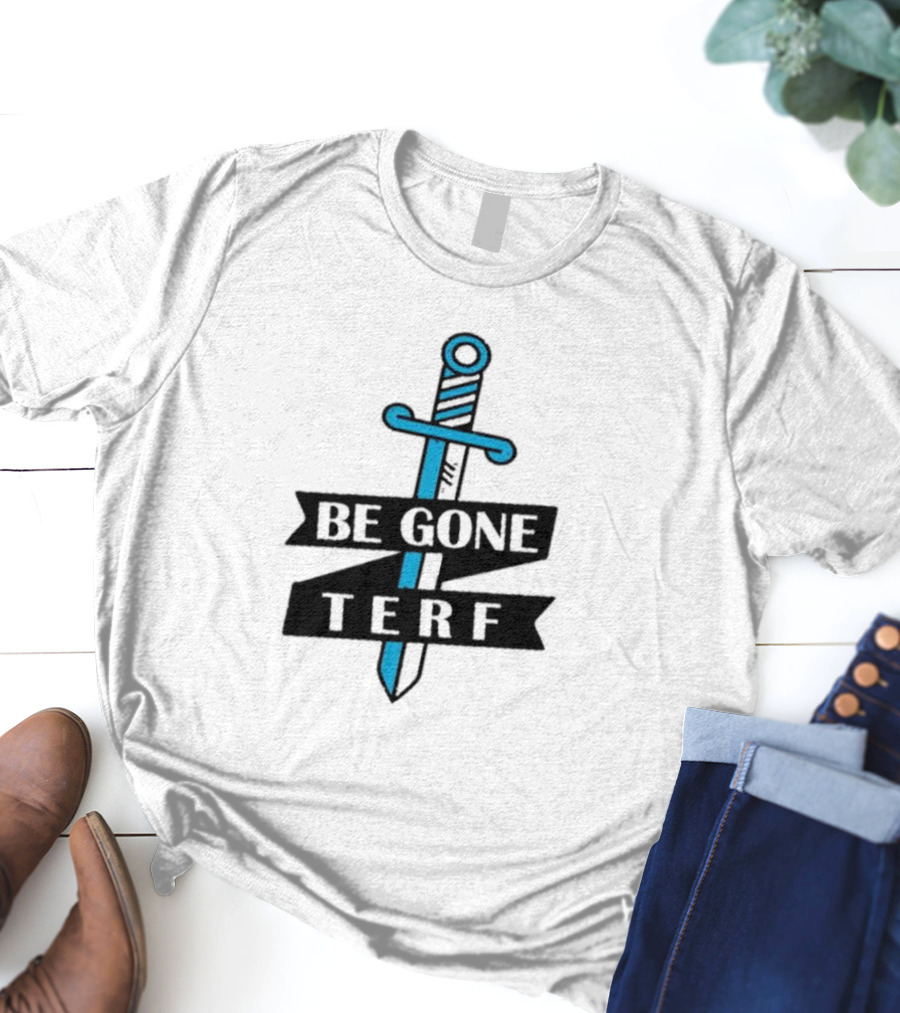 Be Gone Terf Sword Blue Banner Shirt made from 100% pre-shrunk ring-spun cotton, unisex regular fit based on U.S. standard sizing. The shirt is designed, cut, sewn, and printed in the United States. Available in sizes S-5XL.